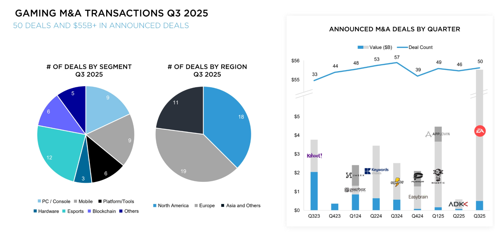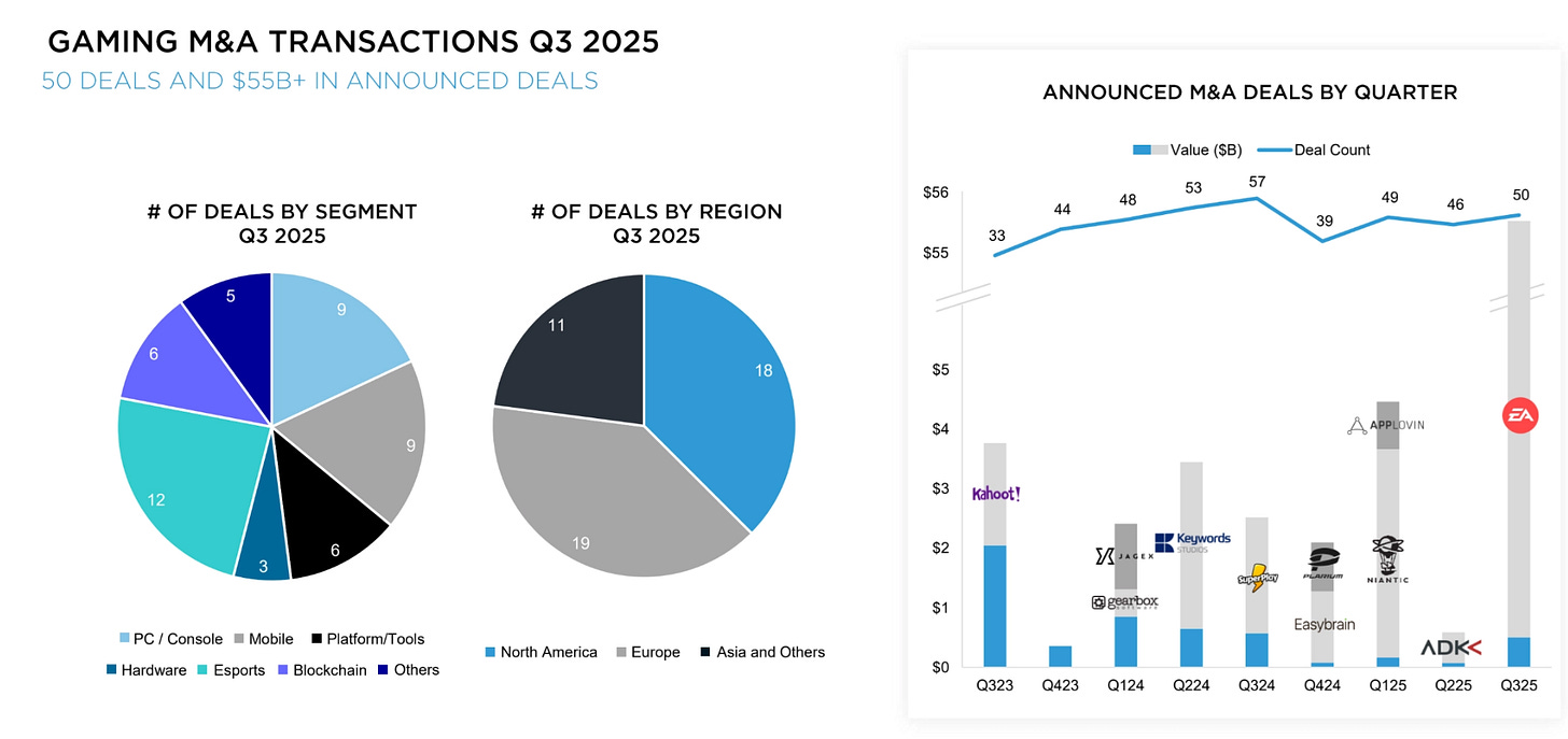Drake Star’s Q3 2025 report revealed record M&A activity led by the largest leveraged buyout in gaming history: a Saudi PIF, Silver Lake, and Affinity Partners consortium acquired Electronic Arts for $55 billion. Overall gaming M&A reached 50 deals, the highest in four quarters. Private financing rebounded for the first time in six quarters with 115 rounds, led by Lingokids ($120M) and Good Job Games ($60M). Western public gaming equities surged, with the Drake Star Western Gaming Index rising 31.3% year-to-date, led by Roblox (+136.9%), Unity (+77.9%), and Everplay (+75.0%). Drake Star expects AI and tools sectors to remain hot, with PE momentum showing no signs of slowing.