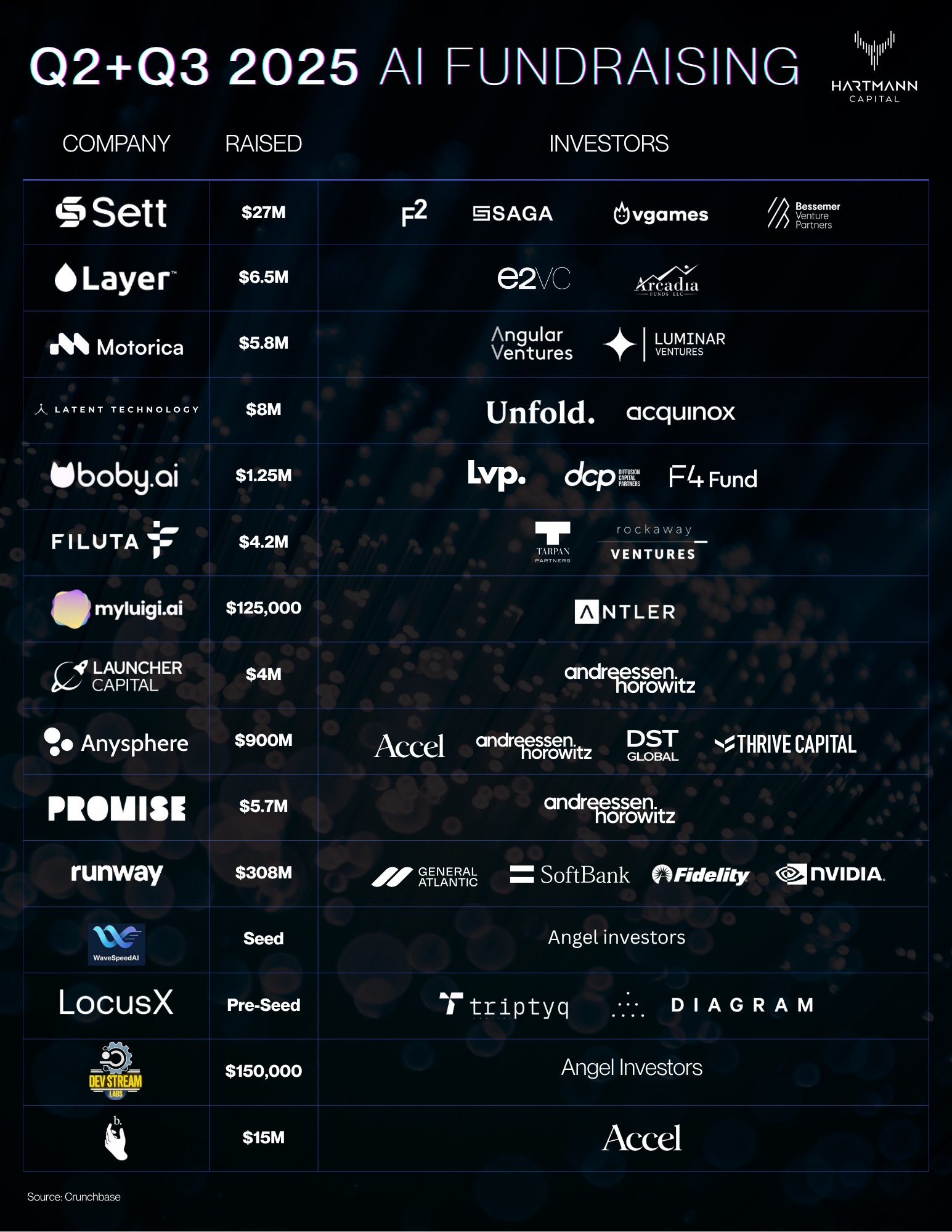 AI companies in gaming and developer tooling captured significant investor attention in Q2 and Q3 2025. Notable funding rounds during this period include: